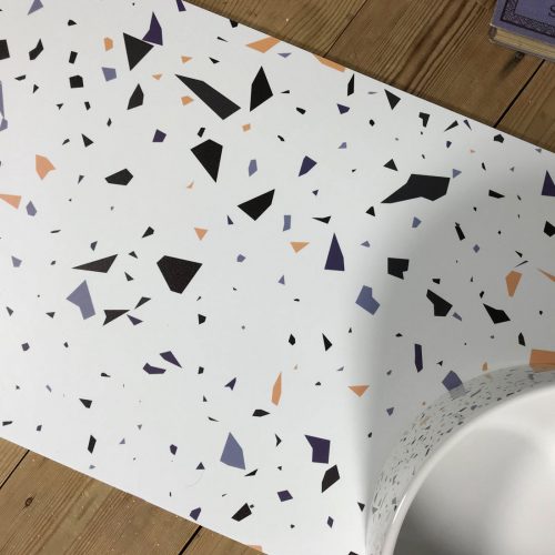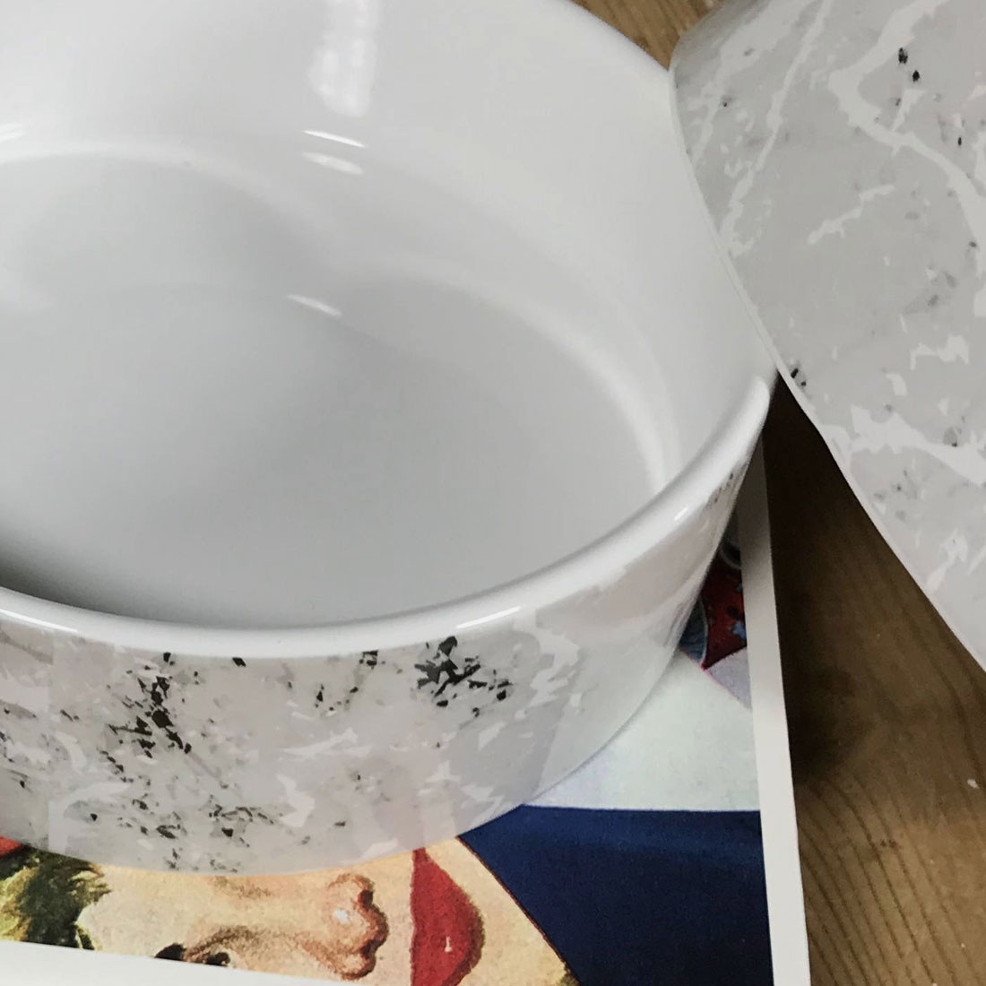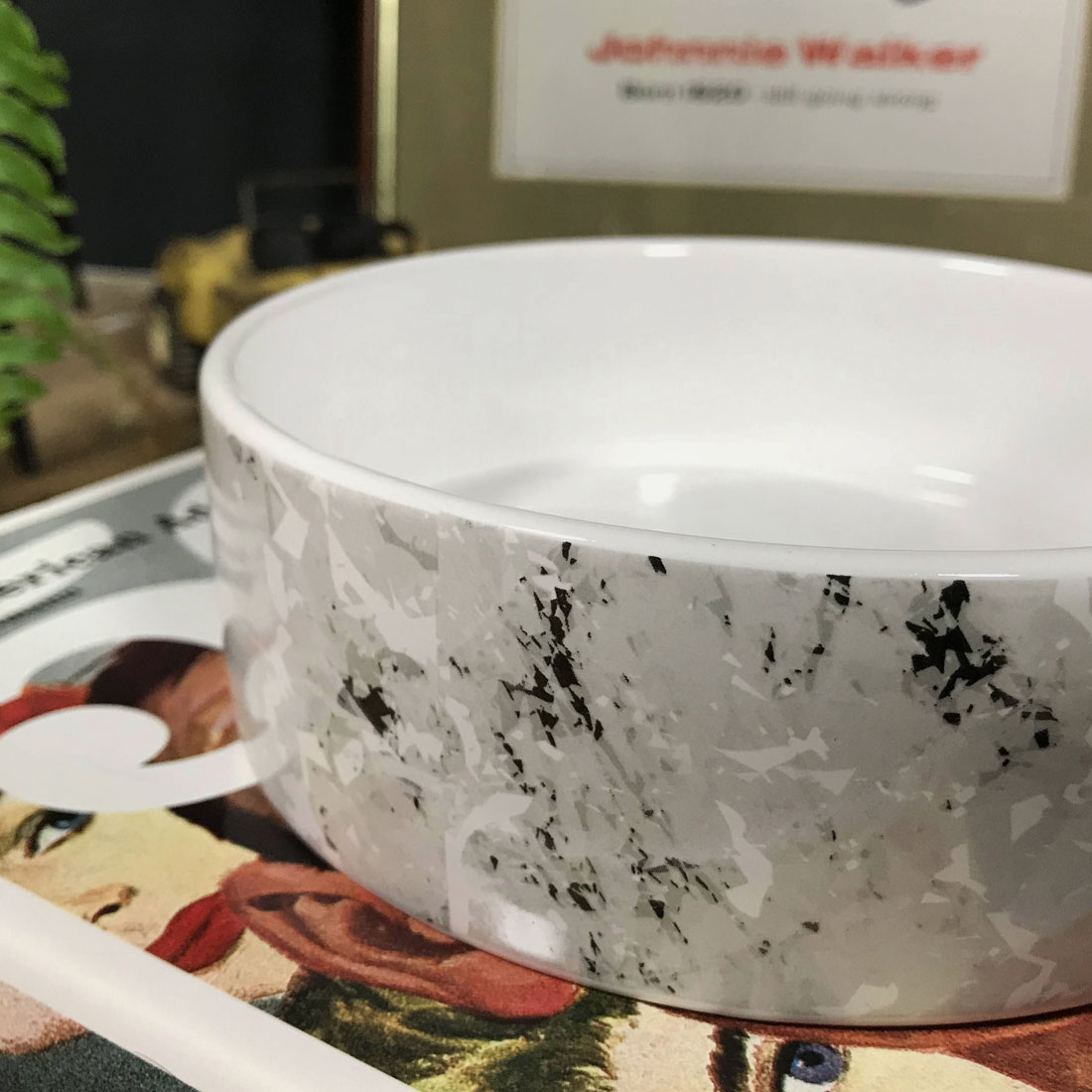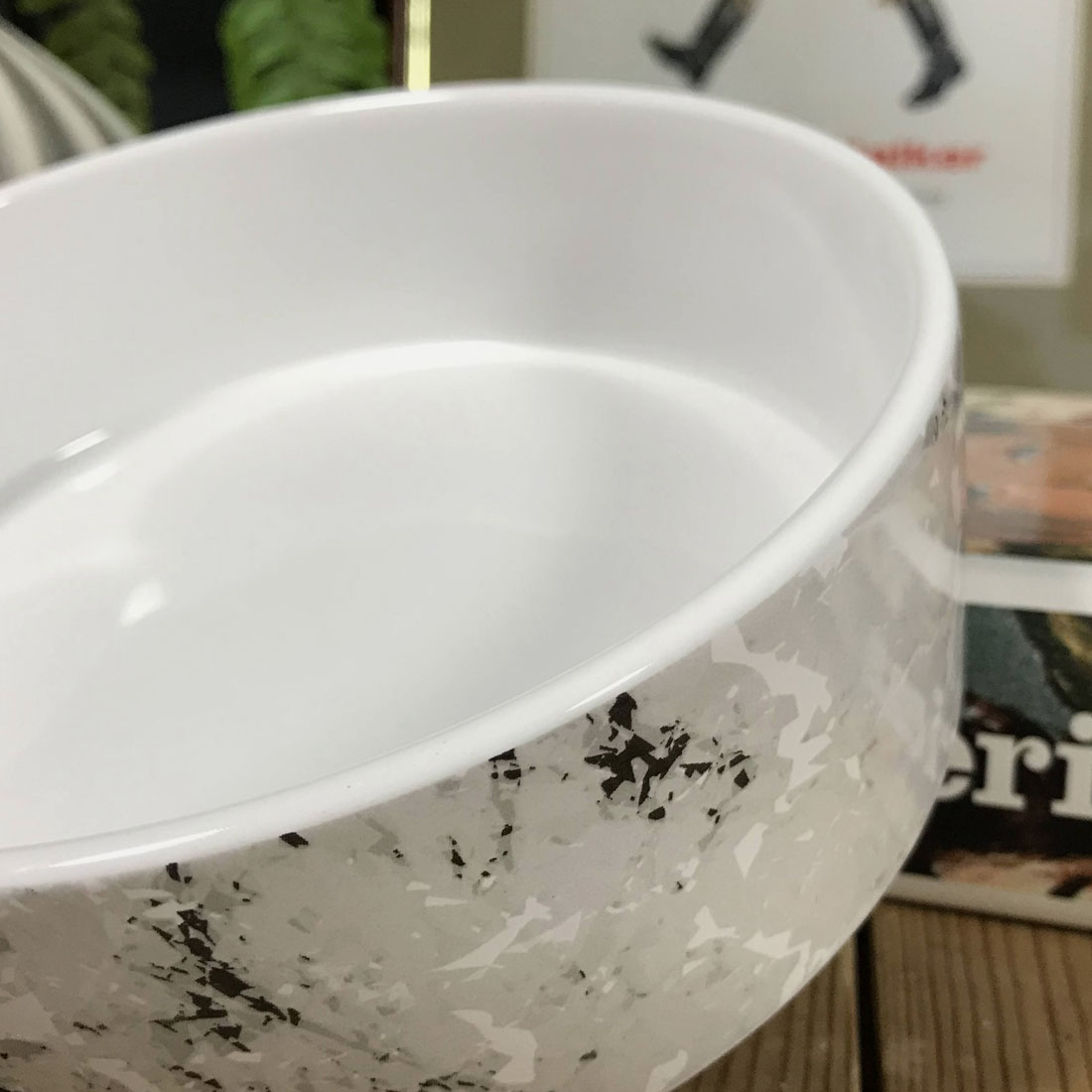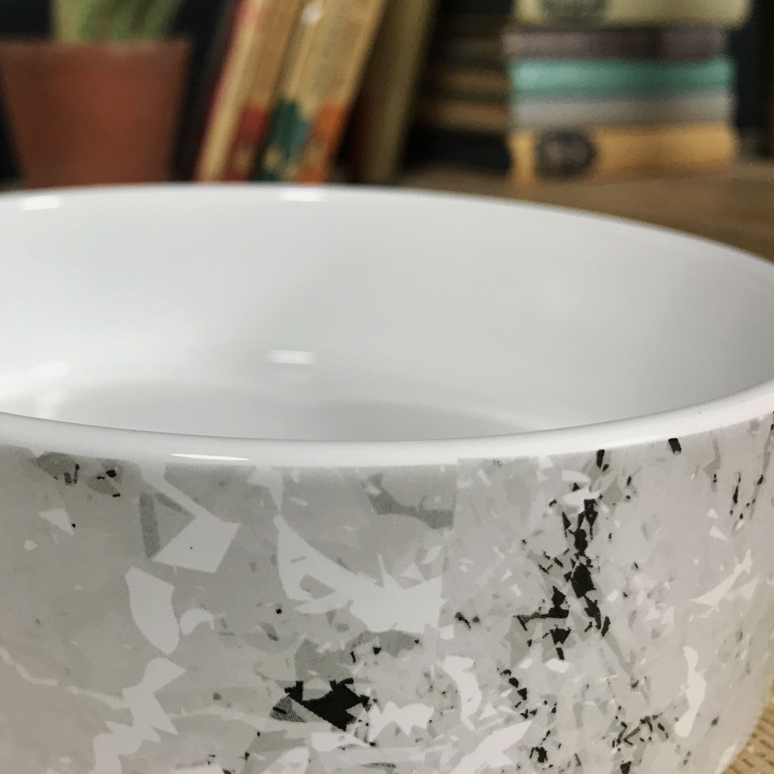 Finished in a grey marble pattern and very industrial-chic. Durable and dishwasher safe.